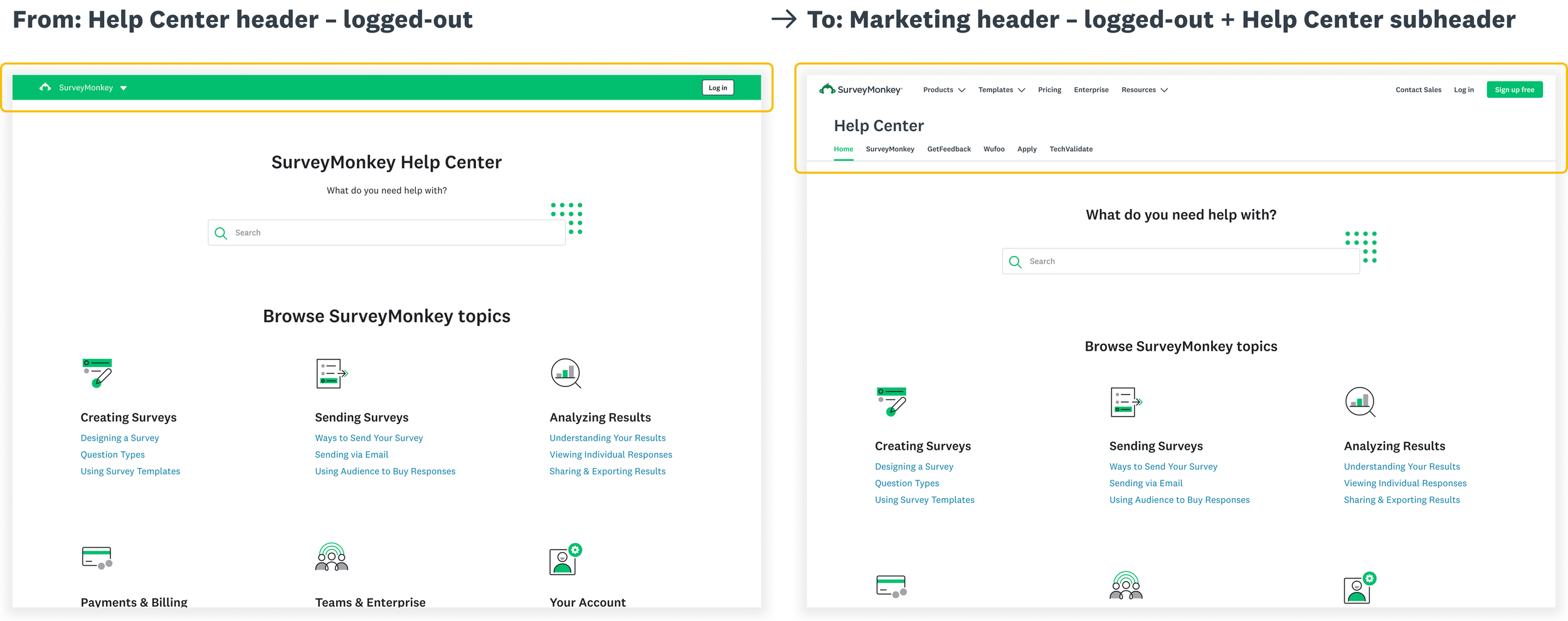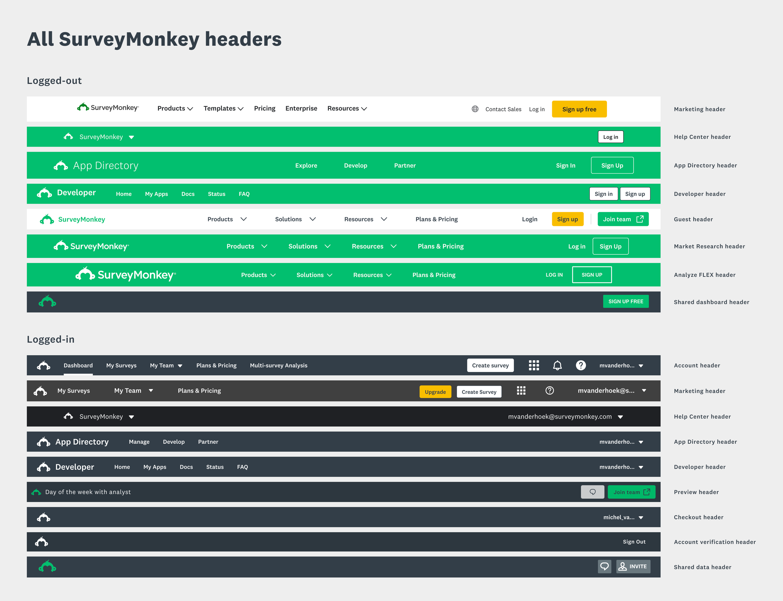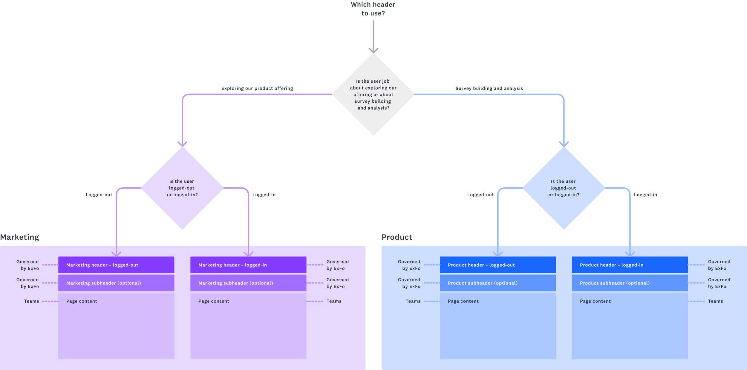 User jobs were at the heart of the new header framework, as any navigation experience should be guided by what users are trying to accomplish with their software product. We re-organized all user jobs across our platform into two categories: Marketing jobs and Product jobs. Marketing jobs focused on exploring our product offering, while Product jobs focused on survey building and analysis. We considered these two job categories foundational to our platform. Each category contained both a logged-out and logged-in header, designed to support the respective user jobs for each state.