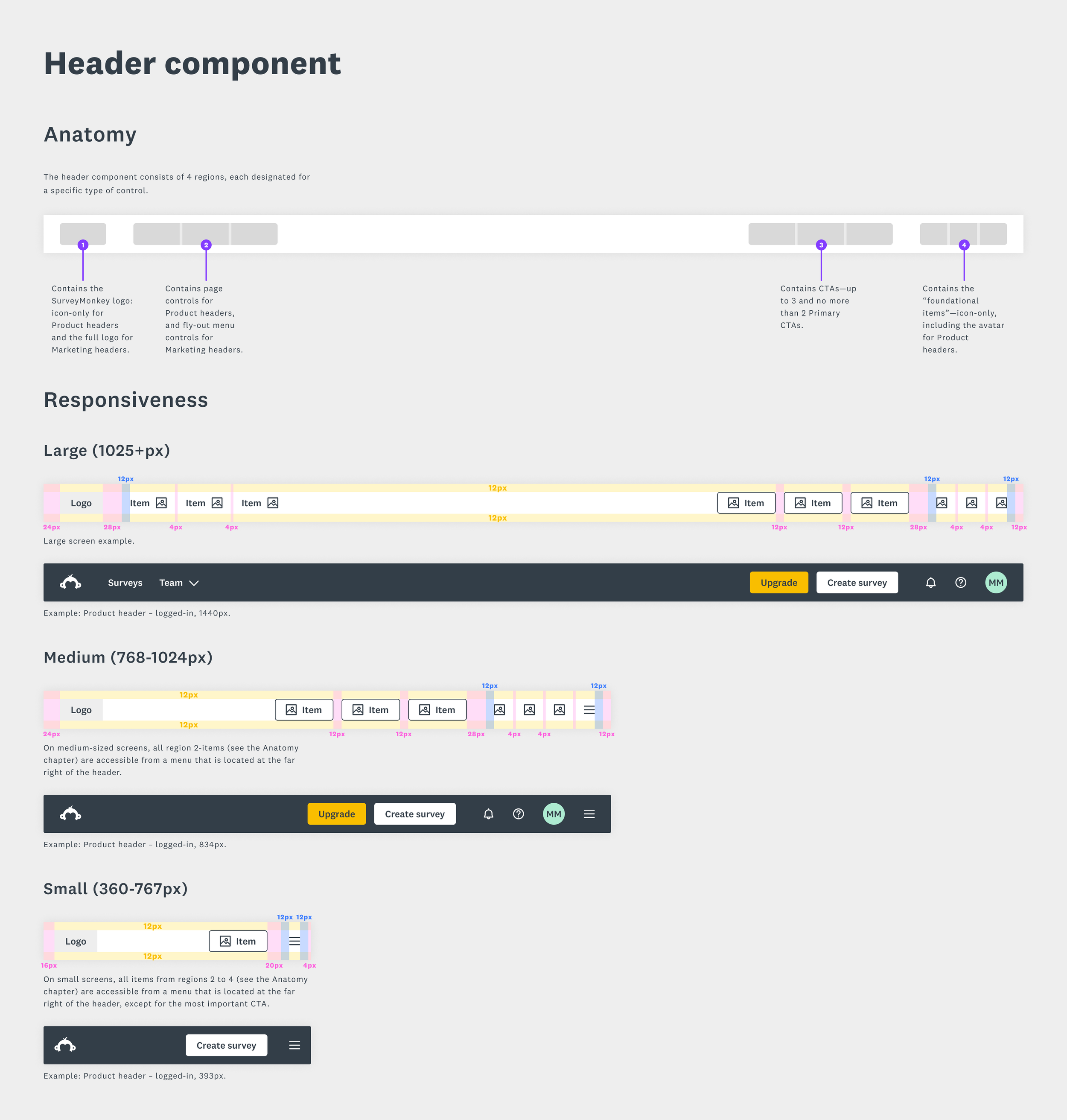 All 4 headers were built on a newly created, shared component — one that previously didn’t exist in our design system. This component incorporated smaller design system controls, such as buttons and tabs, and was designed to responsively adapt across all screen sizes. We also introduced a new subheader component to support navigational pathways that align with the key user jobs of each surface.